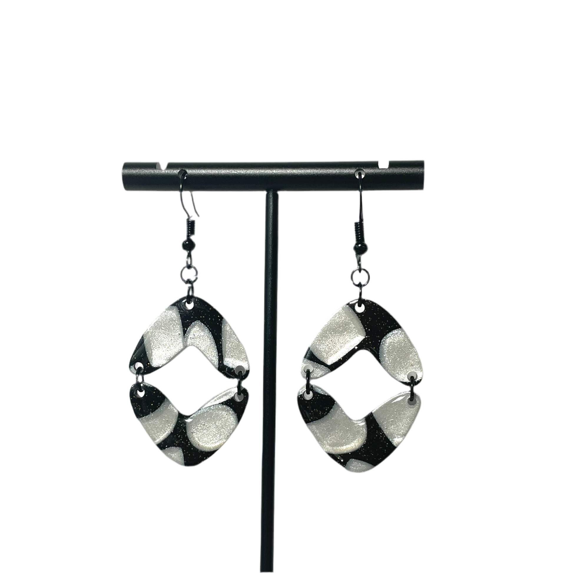 Glossy finish. Black-plated nickel findings. Each pair is unique in its pattern.