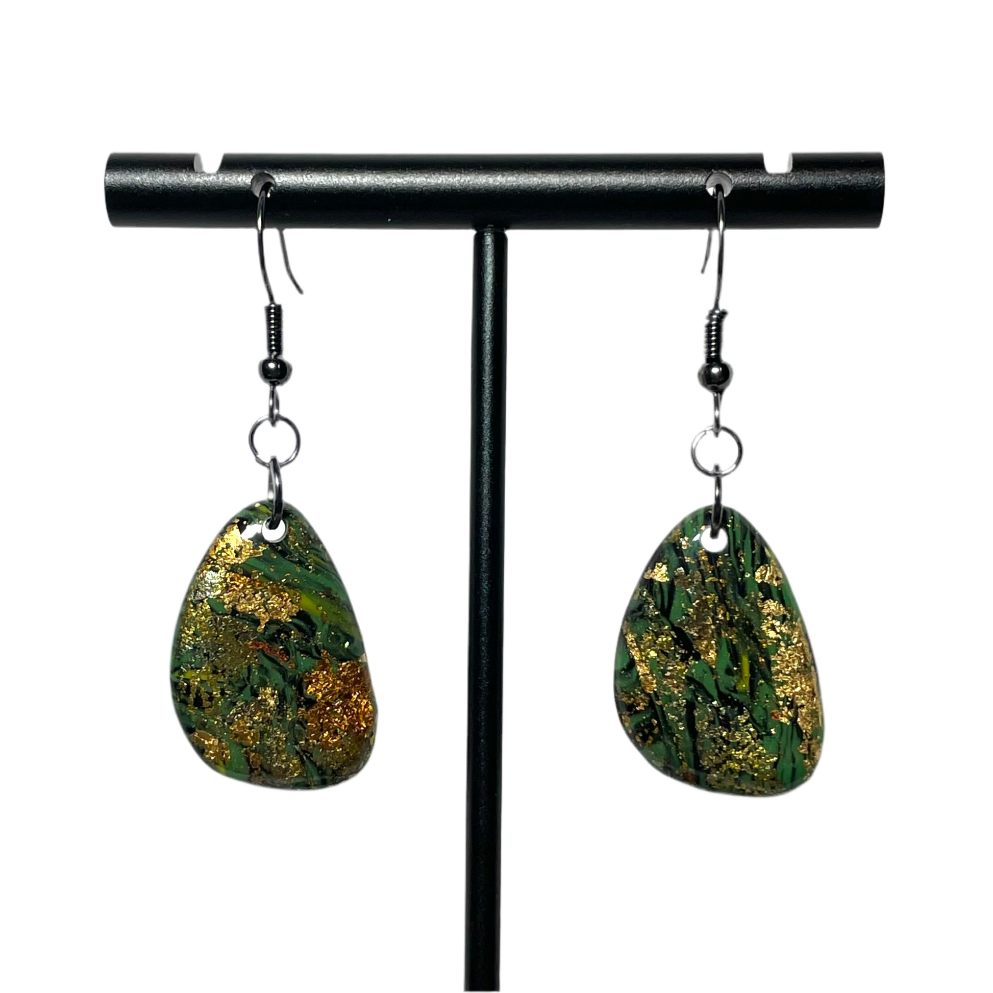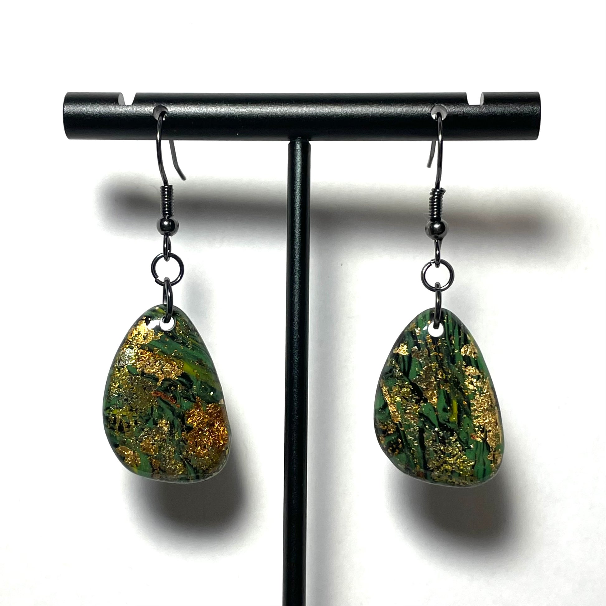 Glossy finish. Black-plated nickel findings. Each pair is unique in its pattern.